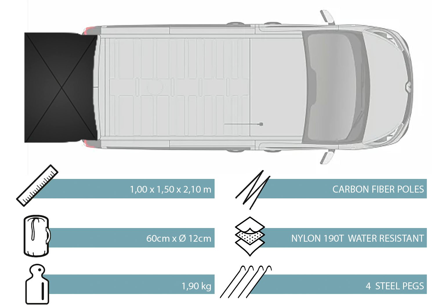 The rear tent roof it's designed to include two rods that increase the height of the interior space. This solution offers the advantage to use the tent to store surfboards, skis, or other bulky items. It also allows you to hang a shower or a lamp if necessary.