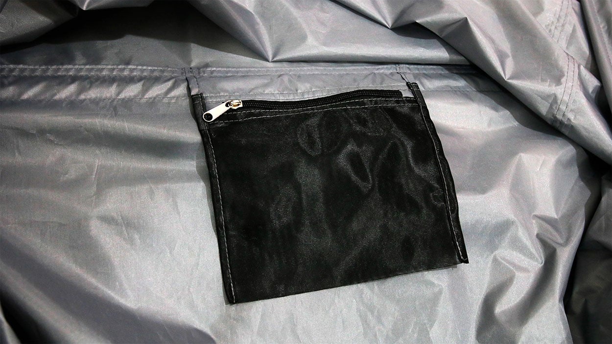 En el interior incluimos un bolsillo de rejilla, con cremallera, donde puedes guardar pequeños botes de gel y champú incluso cuando pliegues la cabina y la metas en su bolsa de transporte.