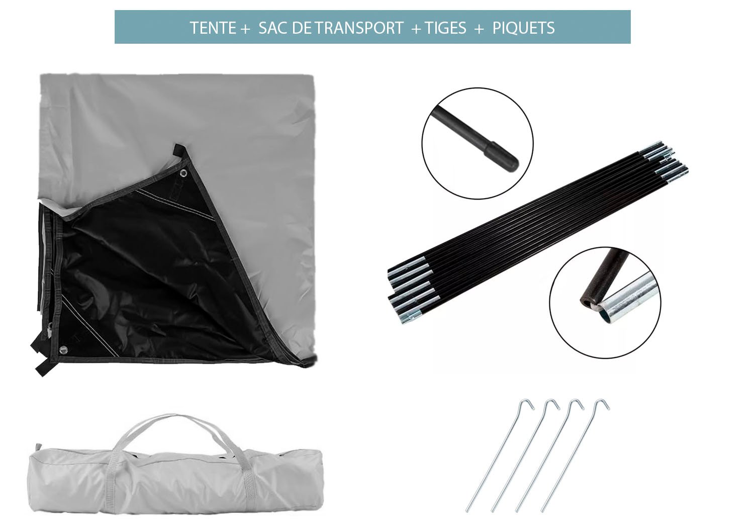 - Fabrication en toile 100 % polyester 190T (étanche, couture collée et anti UV°)