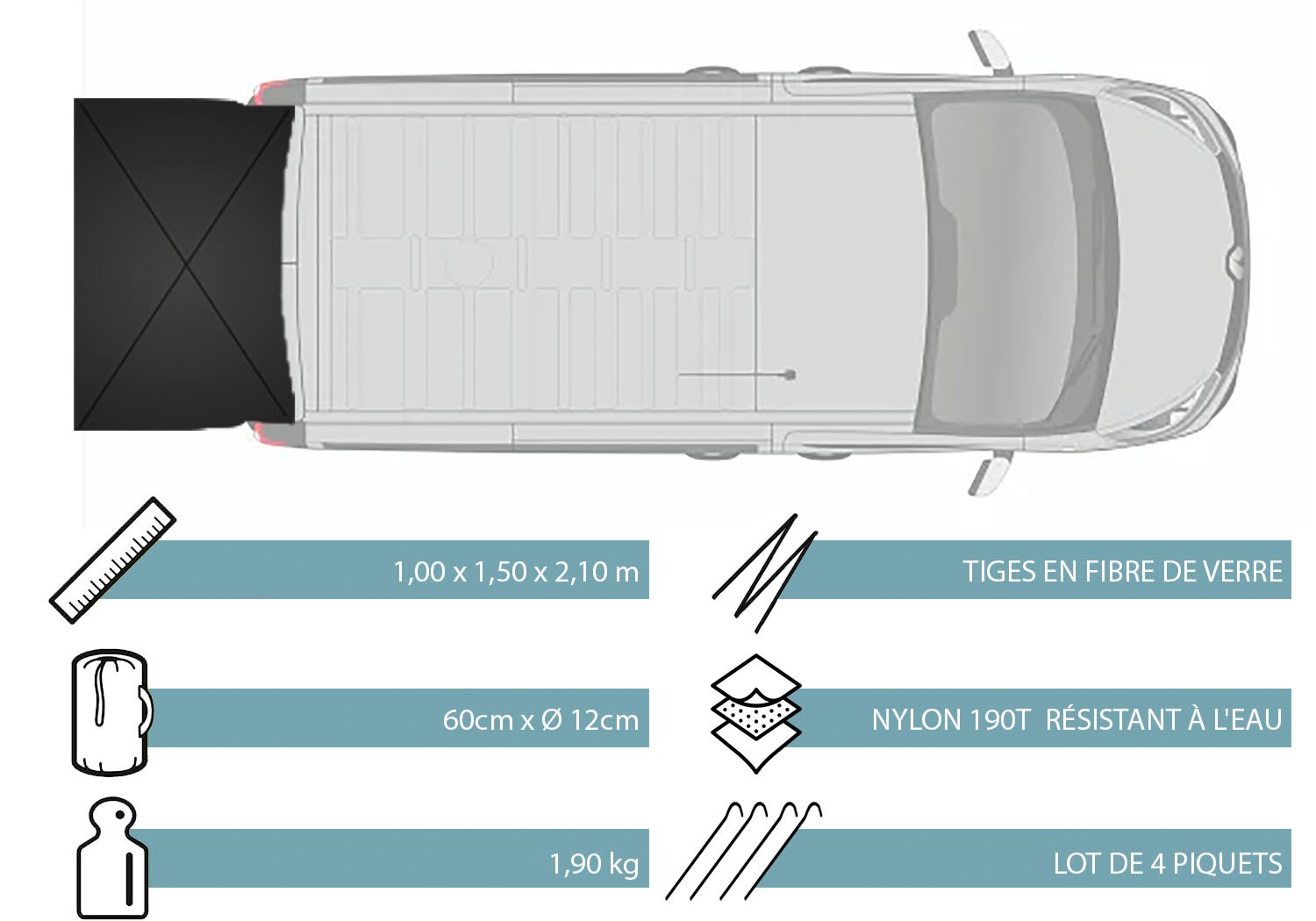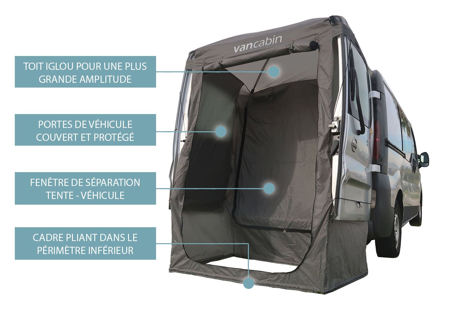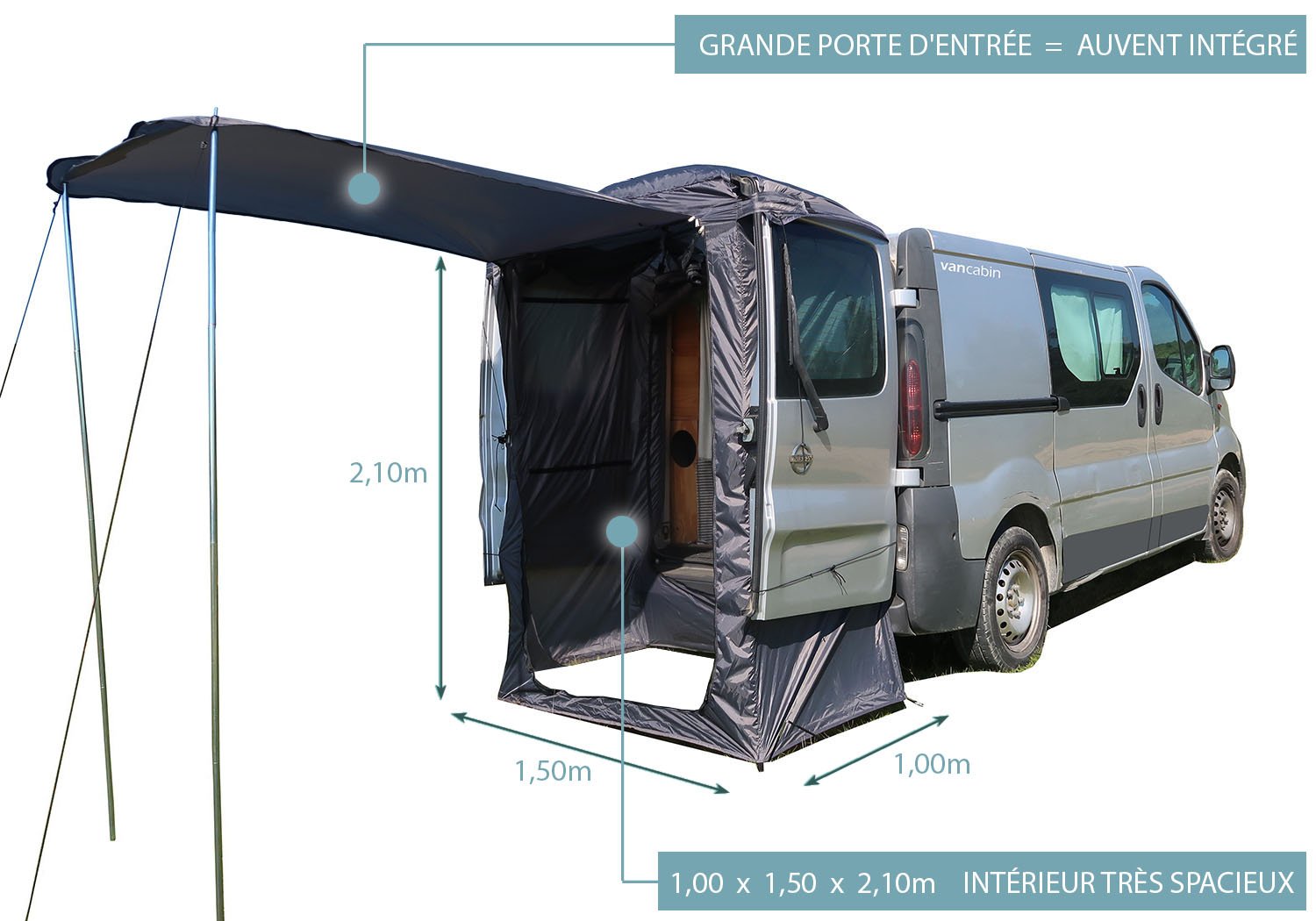 Le Vancabin M2 est un auvent pour double porte arrière de fourgon RENAULT Trafic, OPEL Vivaro y NISSAN Primastar afin d'augmenter l'espace de vie (environ + 40%) en deux minutes seulement. Un vrai plus !