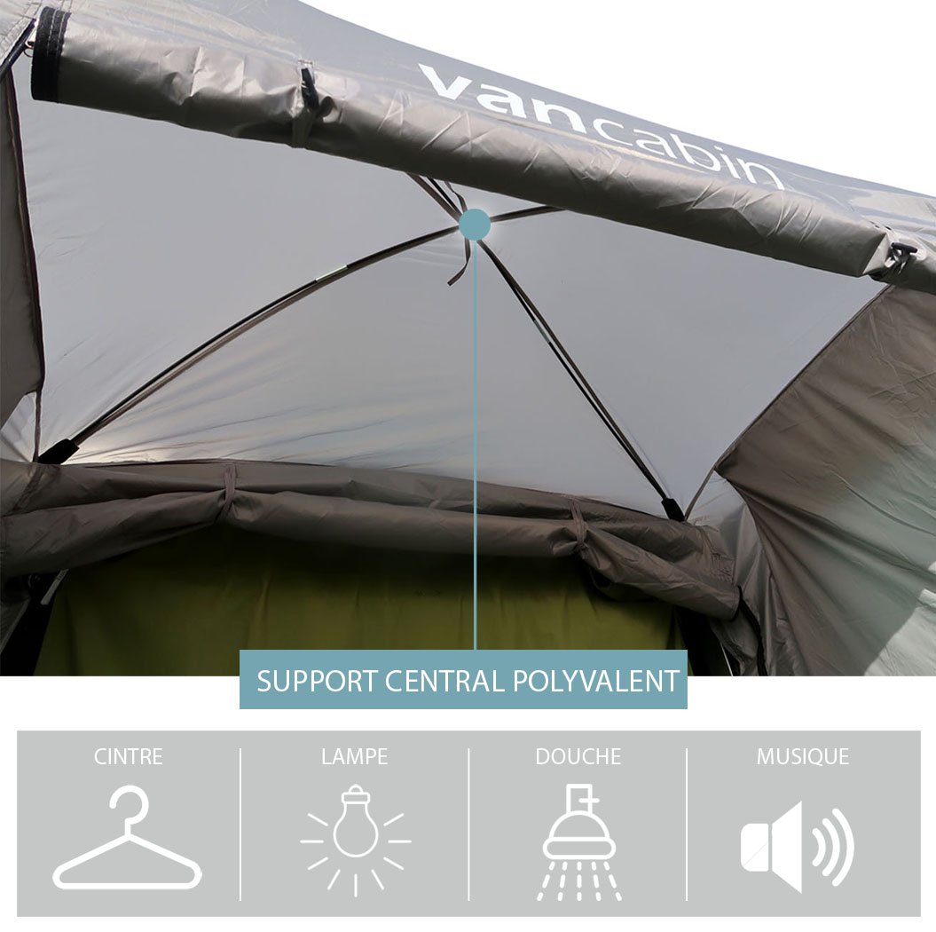 Le toit de la cabine a été conçu pour inclure deux tiges qui augmentent la hauteur de l'espace intérieur. Cette solution offre l'avantage de pouvoir utiliser la tente avec des planches de surf, des skis ou d'autres objets encombrants. Il permet également d'accrocher la douche ou une lampe si besoin.