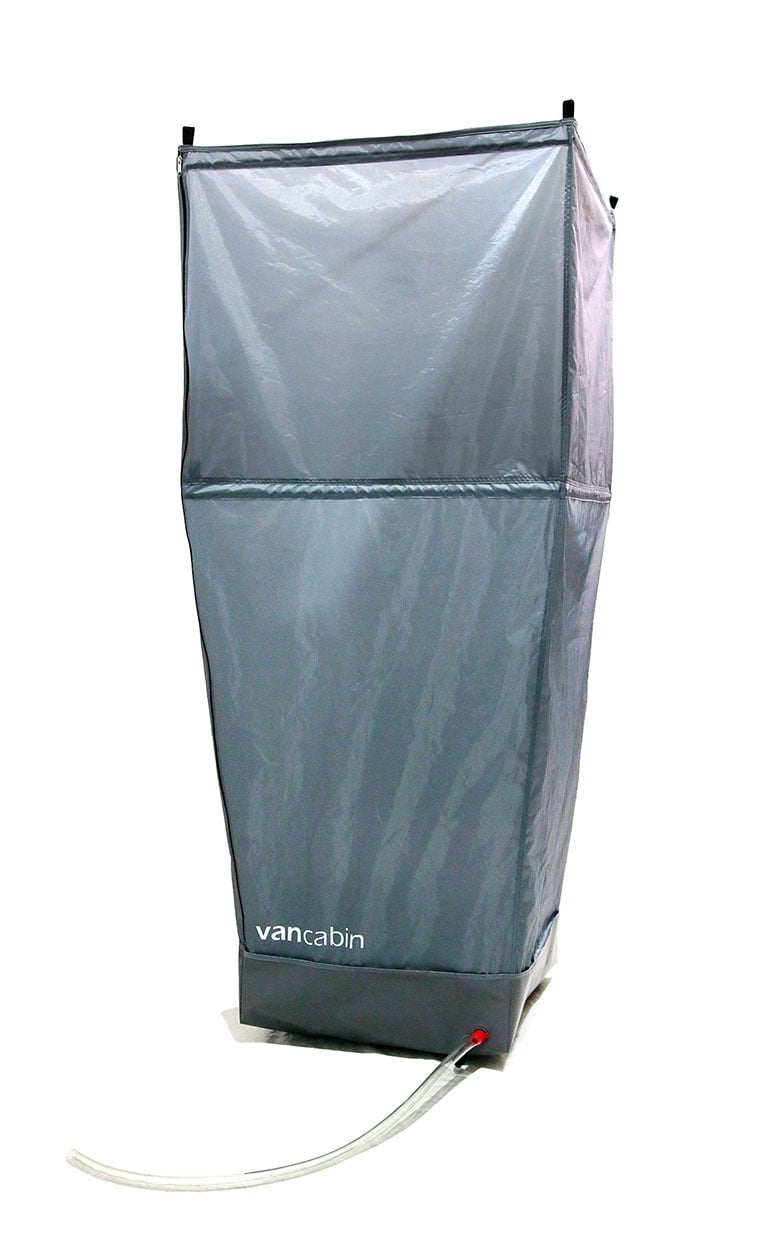 La CABINE DE DOUCHE INTÉRIEURE s'adapte à tous types de véhicules, du Grand Volume (Jumper, Transit, Sprinter) aux fourgons moyens AVEC ou SANS toit relevable (Trafic, Custom, VW