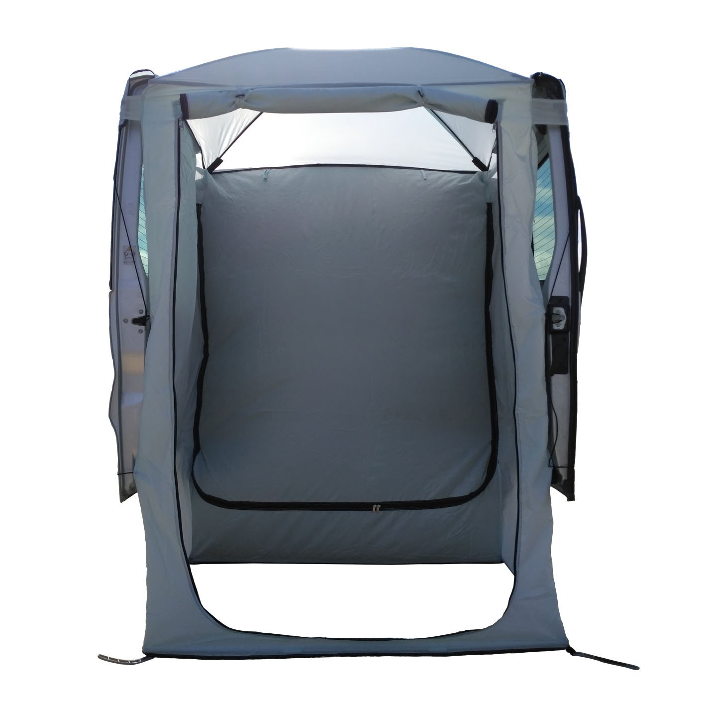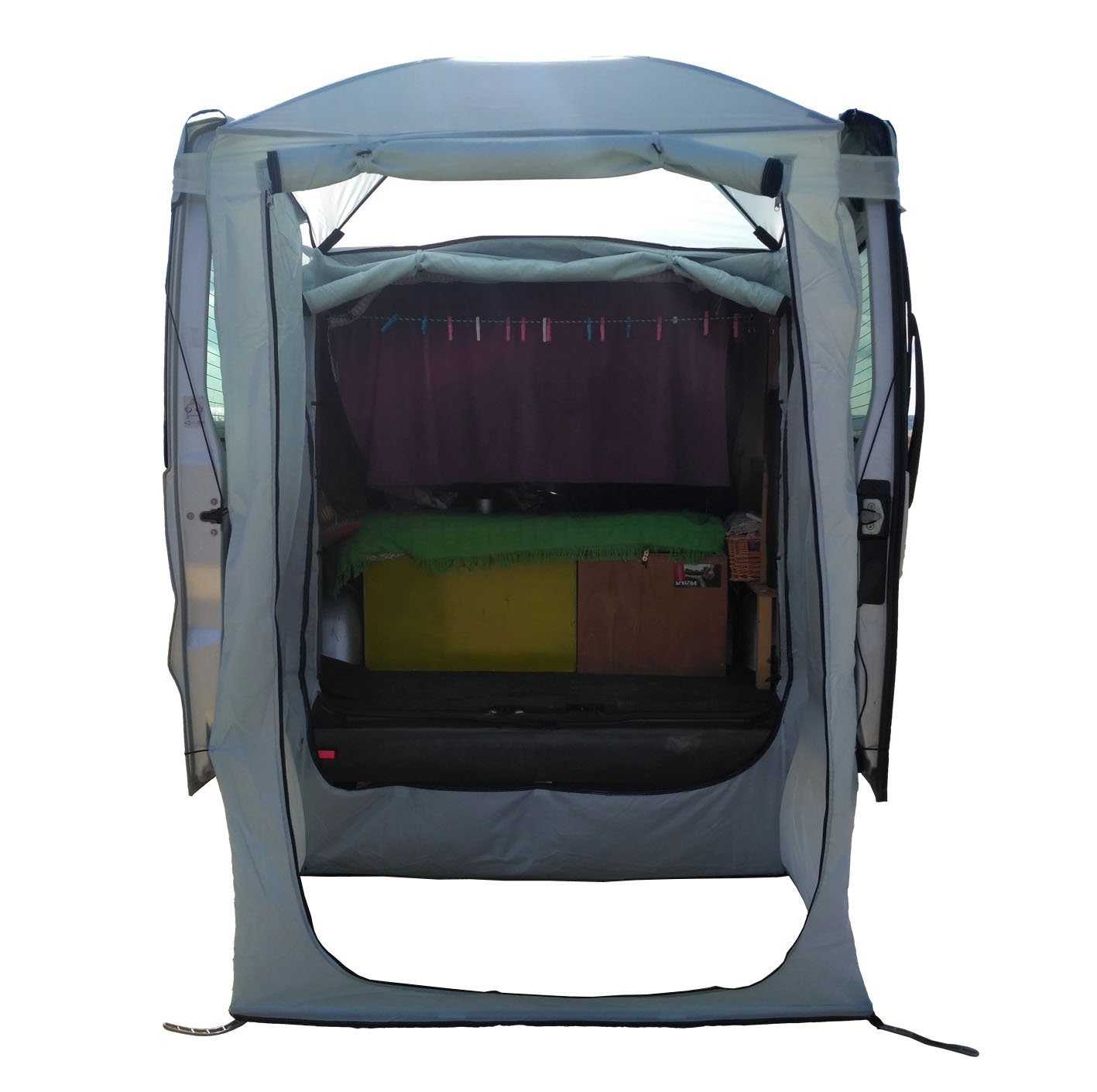 Altro elemento differenziale della tenda è quello di avere di serie una parete che separa la tenda dal furgone camperizzato. Questa parete divisoria si può chiudere o aprire permettendo utilizzare la tenda: 1) come spazio indipendente del veicolo, come doccia, spogliatoio, bagno, ecc. e 2) come veranda o ampliazione del veicolo permettendo l’accesso all’interno di esso indipendentemente della configurazione che abbia il tuo furgone camperizzato (cassonetti, letto, ecc.)
