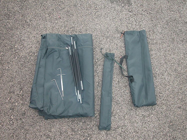 La confezione viene consegnata in una pratica borsa a tracolla che include la tenda, le stecche e 4 spilloni metallici.