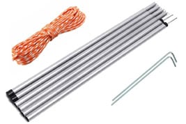 Le stecche di fibra di vetro e gli spilloni unicamente saranno necessari in giornate ventose. La parte inferiore della tenda ha delle guide dove vengono introdotte le stecche, così come quattro elastici di gomma per sistemare i quattro spilloni.