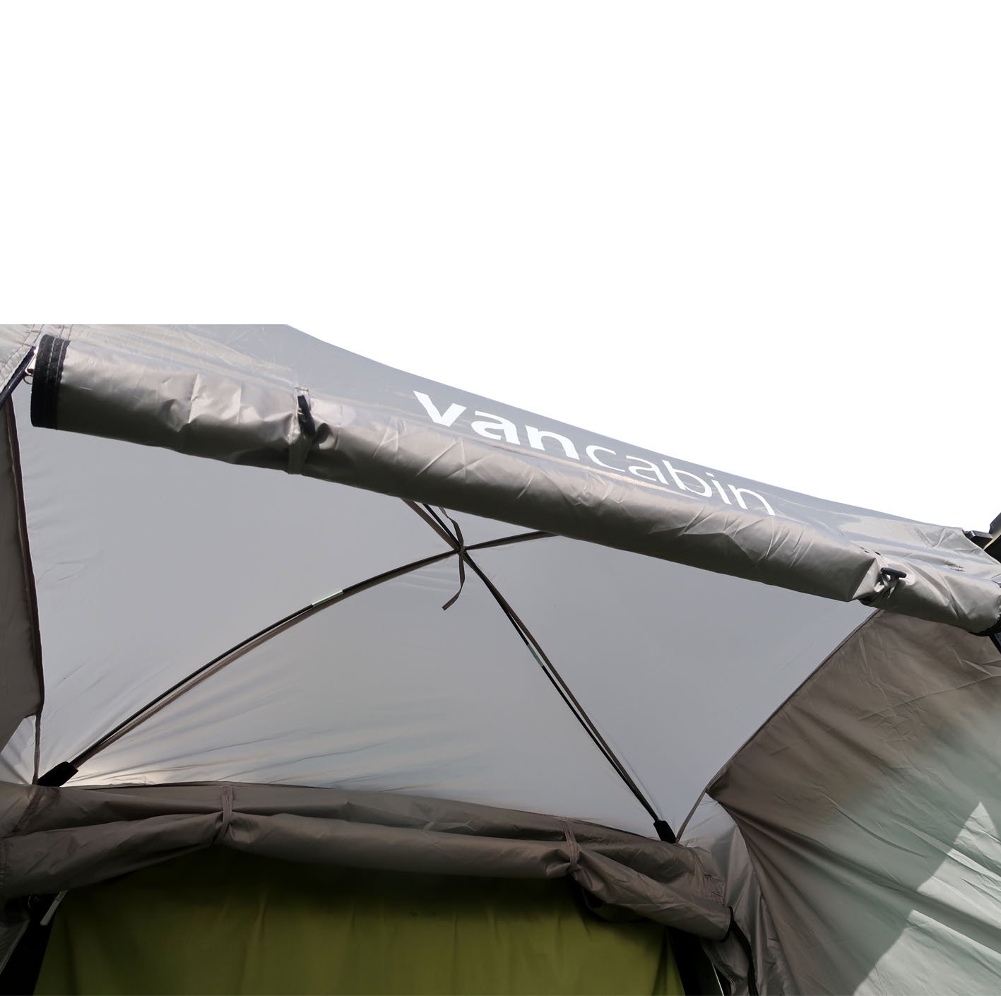 Il tetto della tenda è stato disegnato per includere due bacchette che aumentano l’altezza dello spazio interno della tenda. Questa soluzione offre il vantaggio di poter utilizzare la tenda con tavole da surf, degli sci e altri elementi voluminosi. Permette inoltre appendere il soffione della doccia o una lampada nel caso sia necessario.
